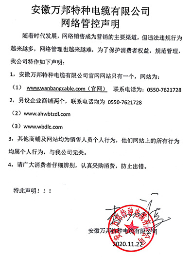 鄭重聲明:安徽萬邦特種電纜有限公司官方網站為:www_wanbangcable_com.beifanghongrui.cn,除此之外無任何子網站或合作網站,其余均為假冒偽劣。電話:0550-7621728 13485756353 地 址:安徽省天長市滁州高新技術產業開發區經四路29號